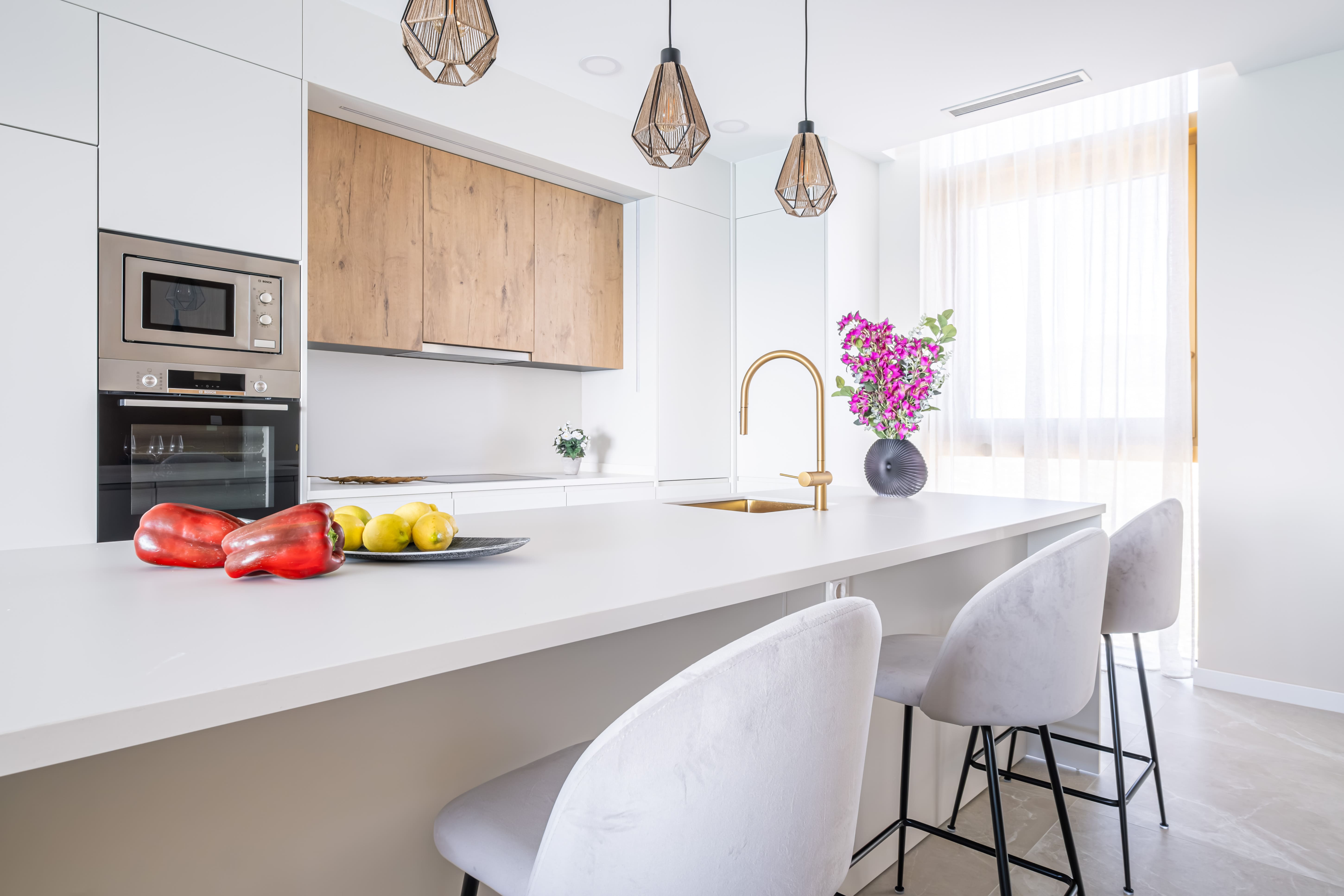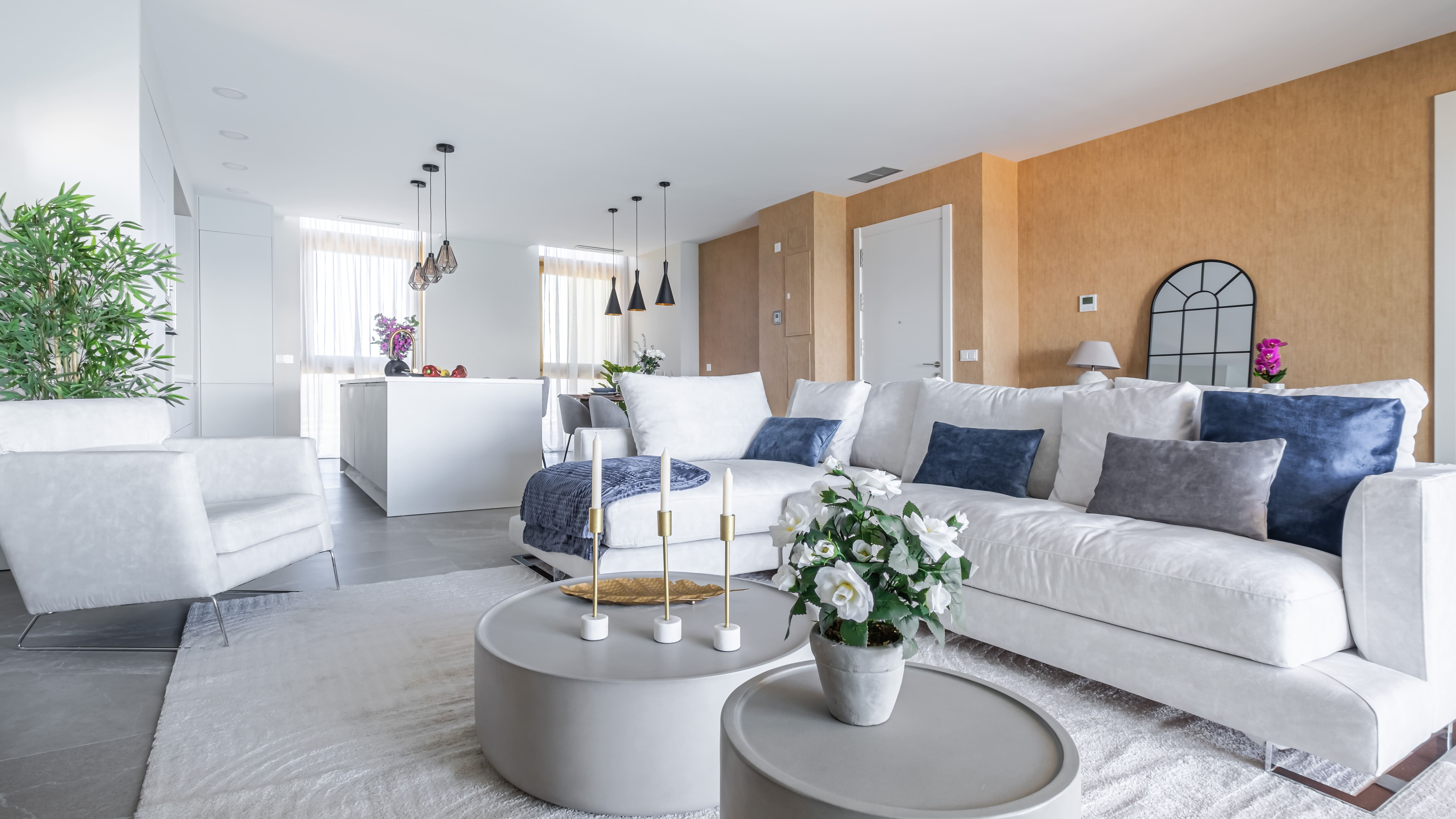 The spacious living area seamlessly connects to the terrace through sliding glass doors, offering breathtaking views of the Mediterranean Sea and Benidorm's coastline.